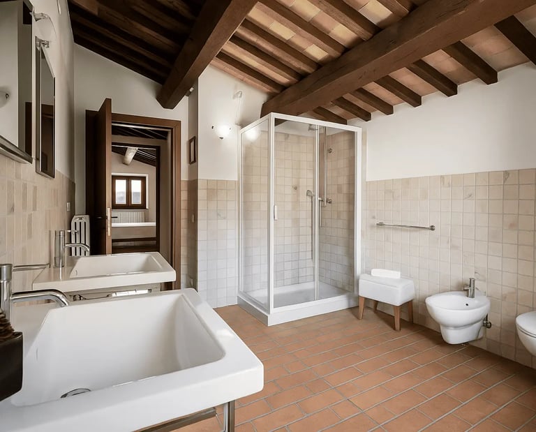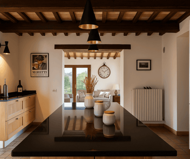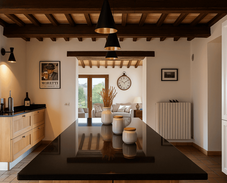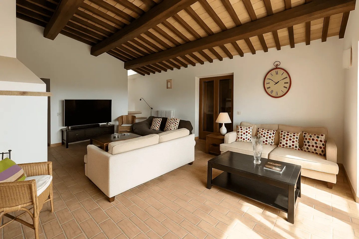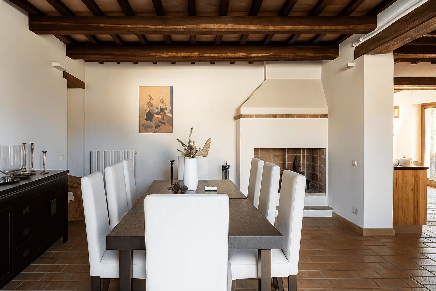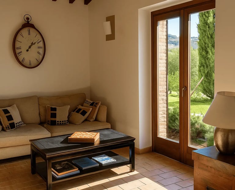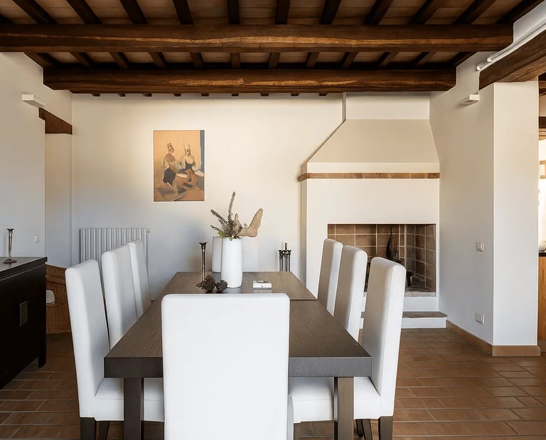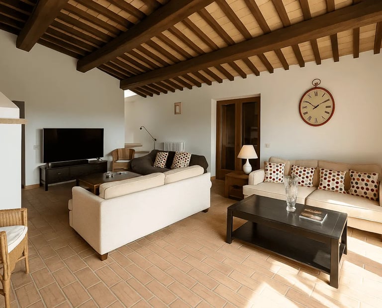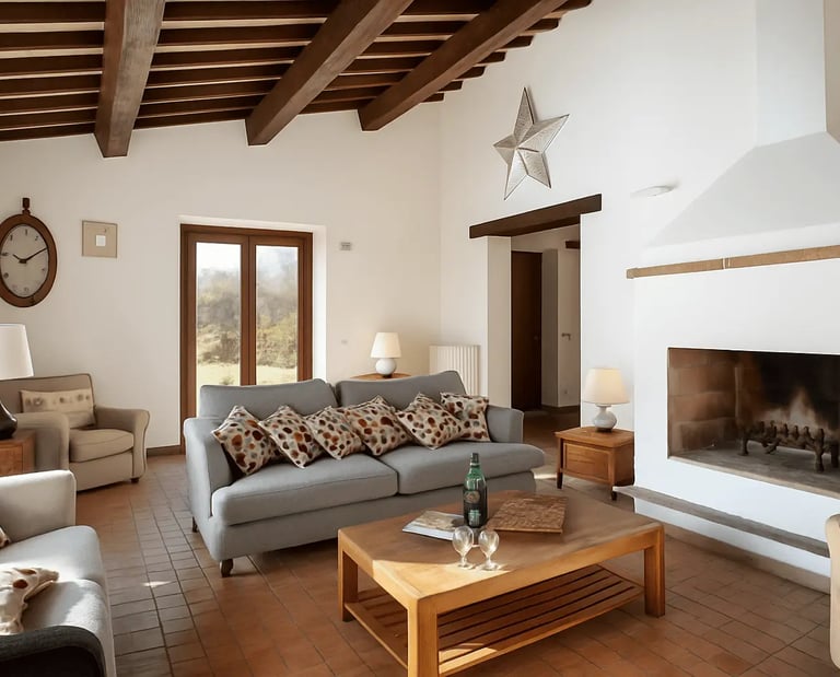 Restaurata con cura e stile, Villa Adele dispone di un ampio soggiorno con comodi divani, un camino antico e pavimenti in cotto che uniscono calore e tradizione. Travi in legno a vista e dettagli studiati creano un’atmosfera accogliente ed elegante.