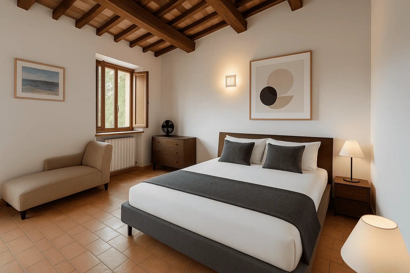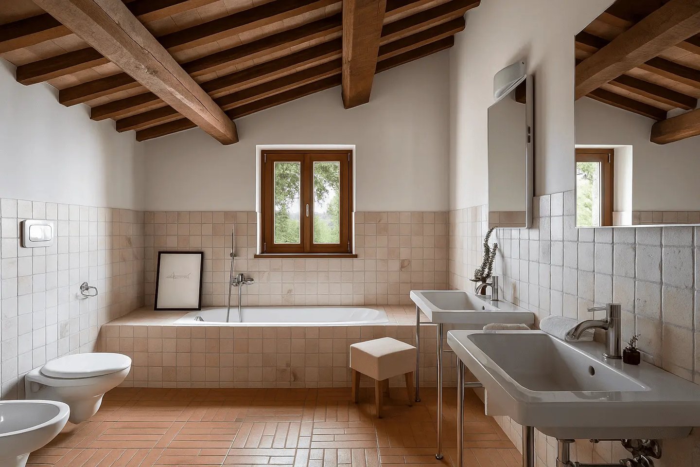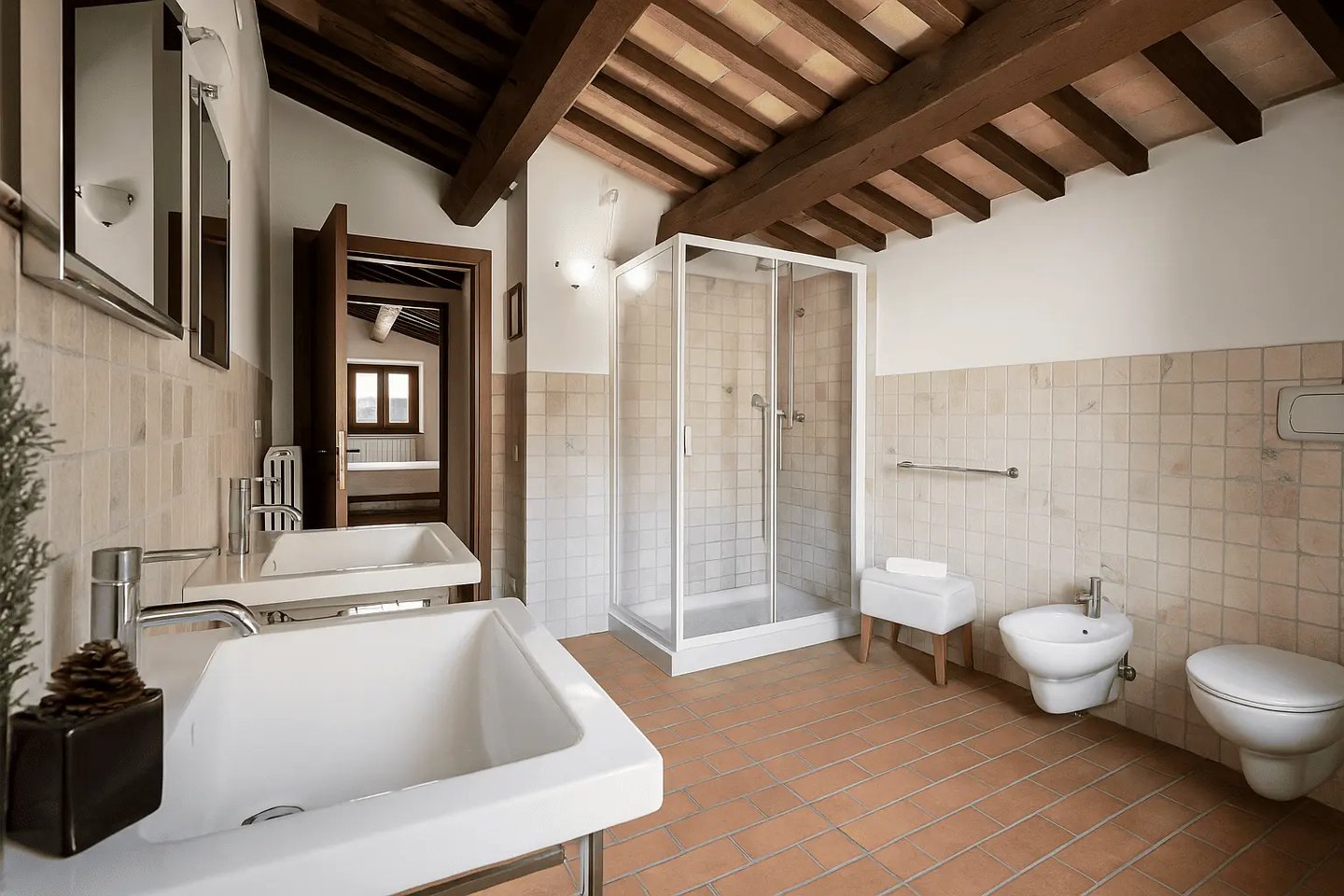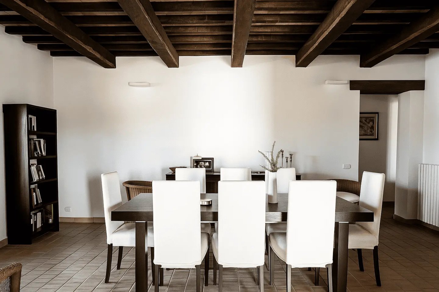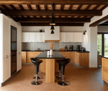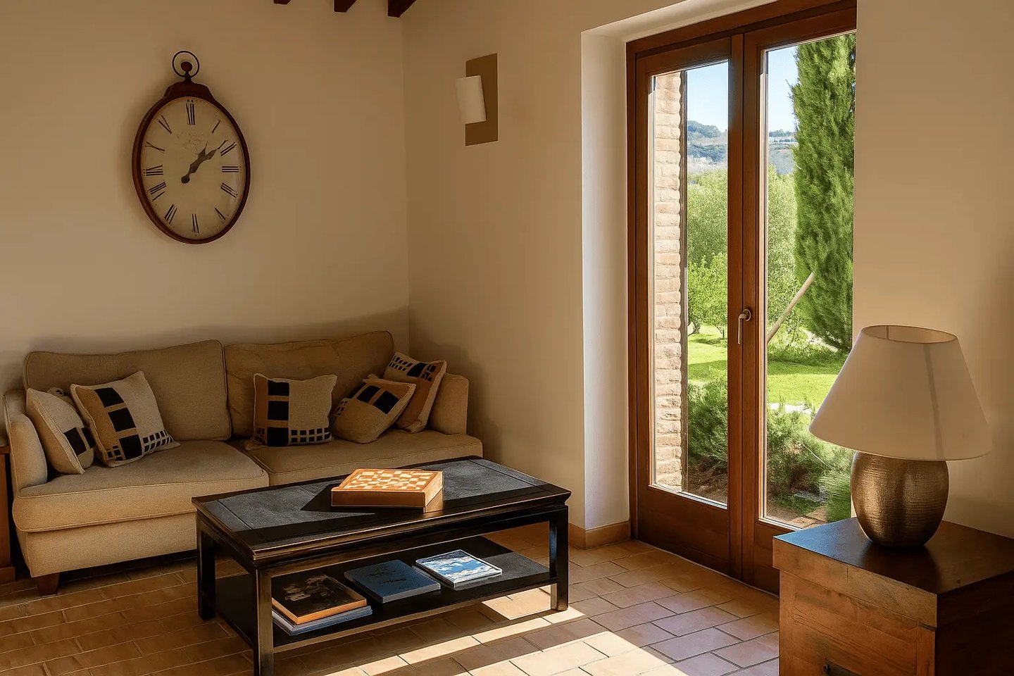Restaurata con cura e stile, Villa Adele dispone di un ampio soggiorno con comodi divani, un camino antico e pavimenti in cotto che uniscono calore e tradizione. Travi in legno a vista e dettagli studiati creano un’atmosfera accogliente ed elegante.