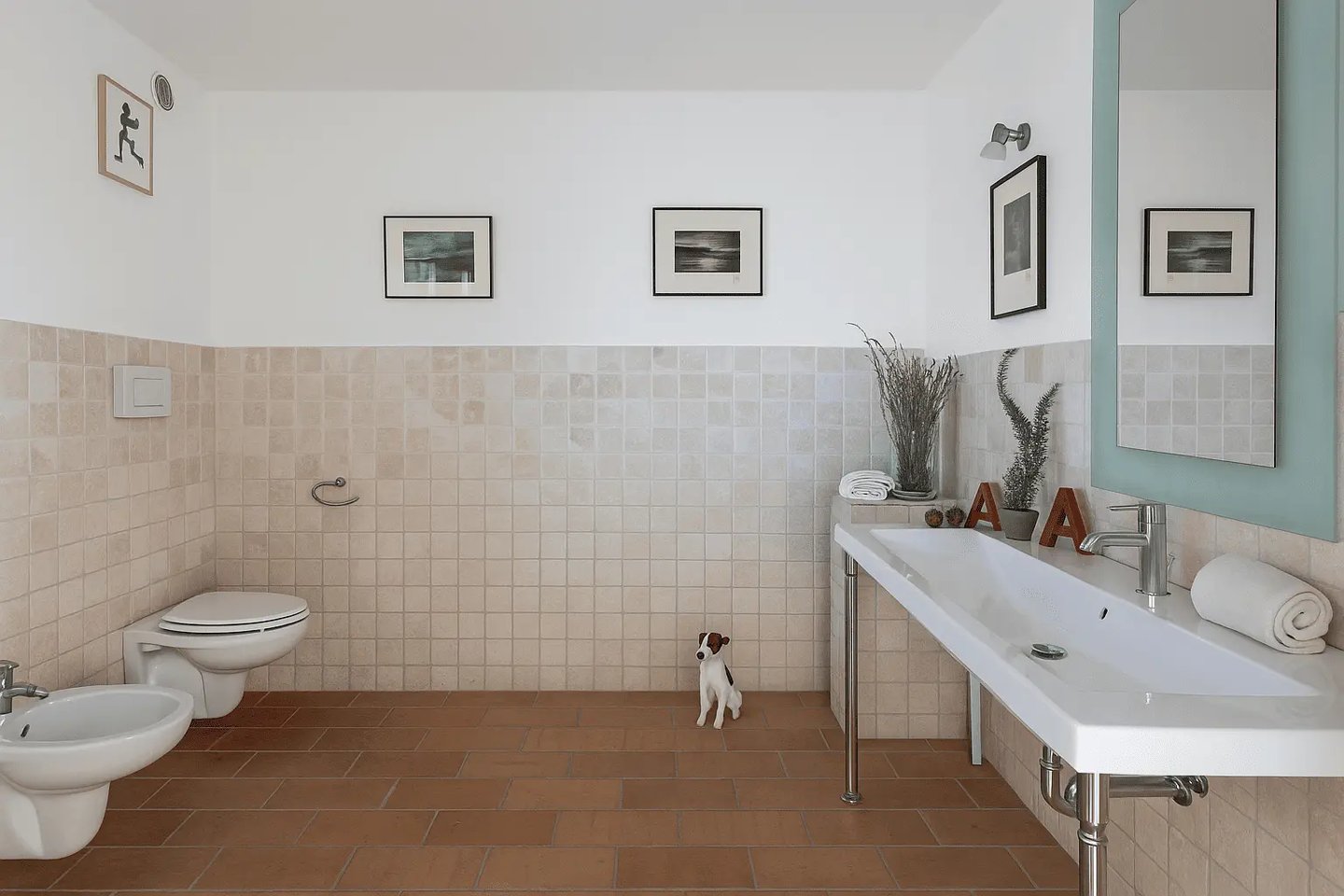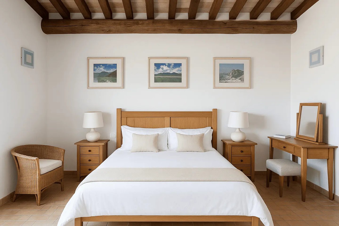 Al piano superiore ci sono tre camere da letto ampie e luminose e due bagni. Ogni stanza è arredata con uno stile unico, combinando fascino classico e tocchi moderni, e piena di luce naturale.