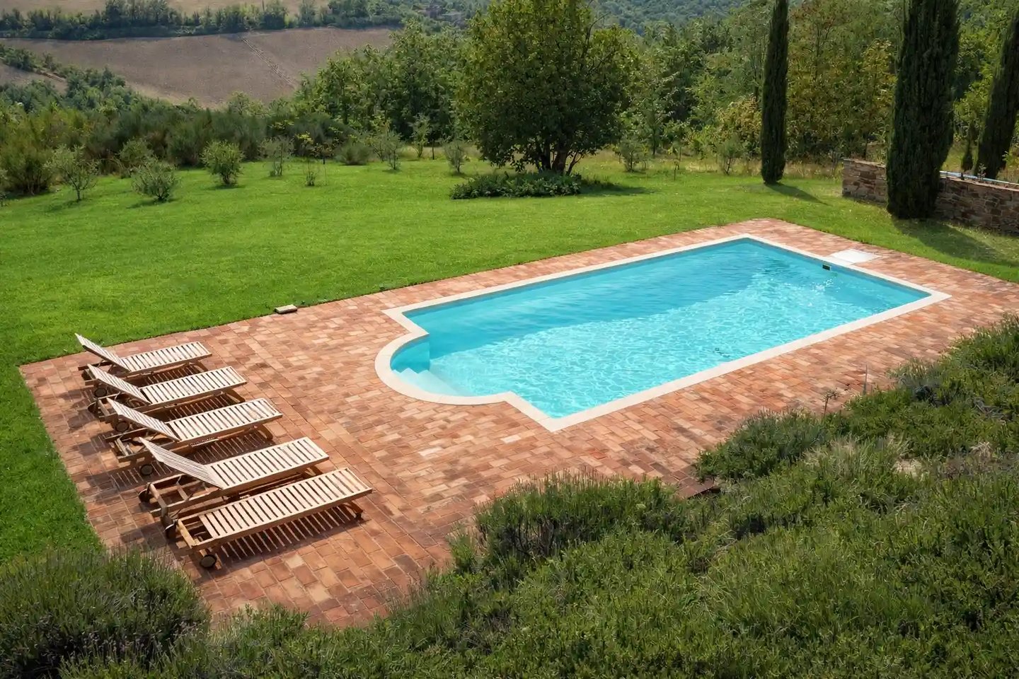 All’esterno, il grande patio si apre su un bellissimo giardino, dove lavanda e verde circostante creano un’atmosfera rilassante. La piscina privata in pietra offre viste panoramiche sulle colline ed è il luogo ideale per mattine tranquille, pomeriggi soleggiati o serate serene.