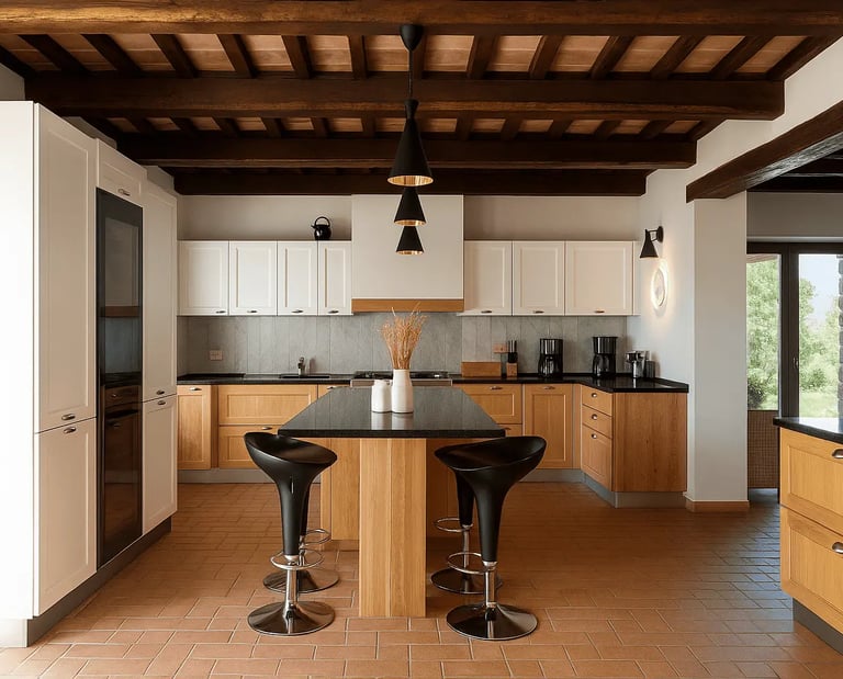 La cucina moderna è completamente attrezzata con elettrodomestici di alta qualità e un’isola centrale, perfetta per cucinare con comodità e condividere i pasti nella zona pranzo adiacente.