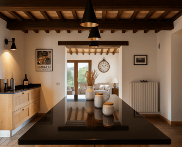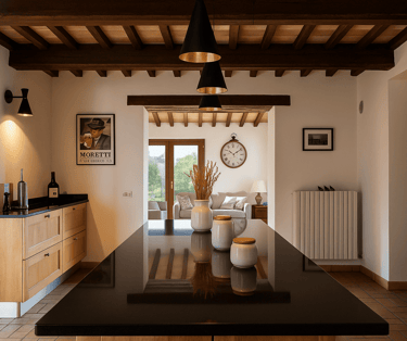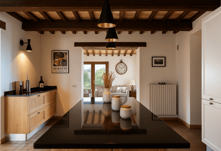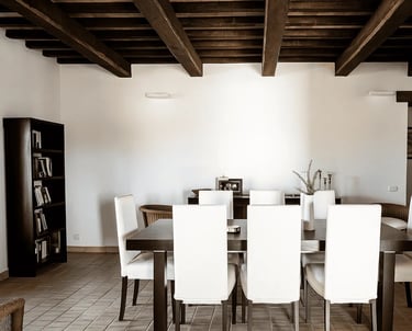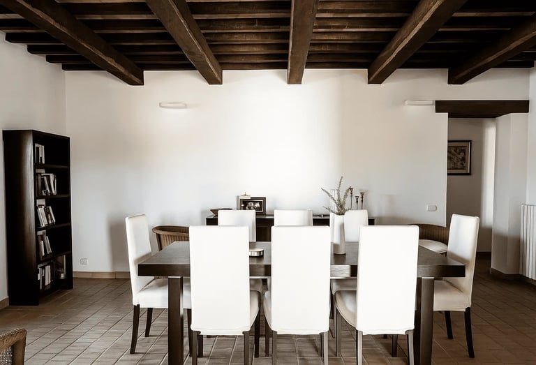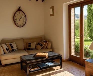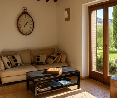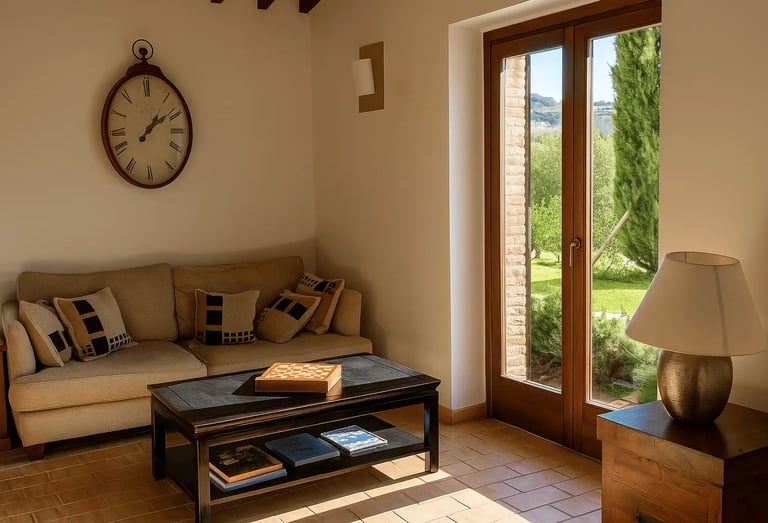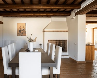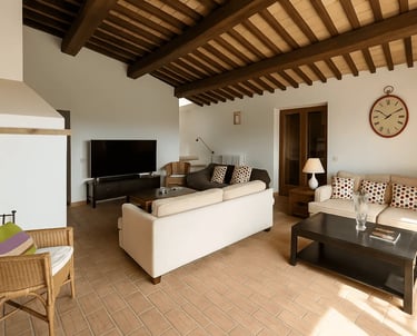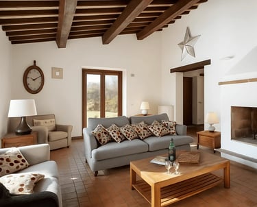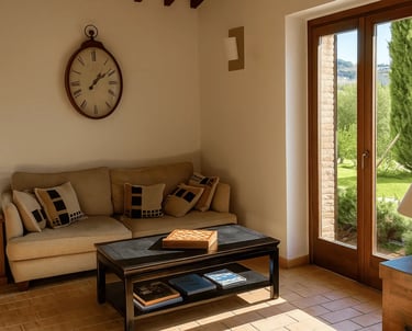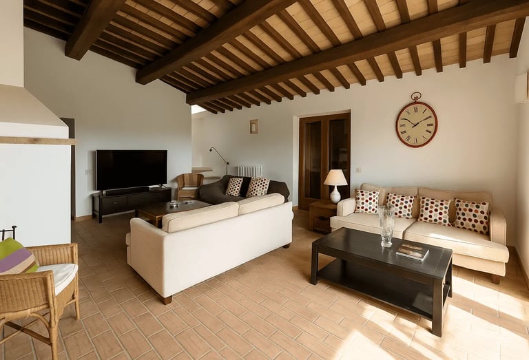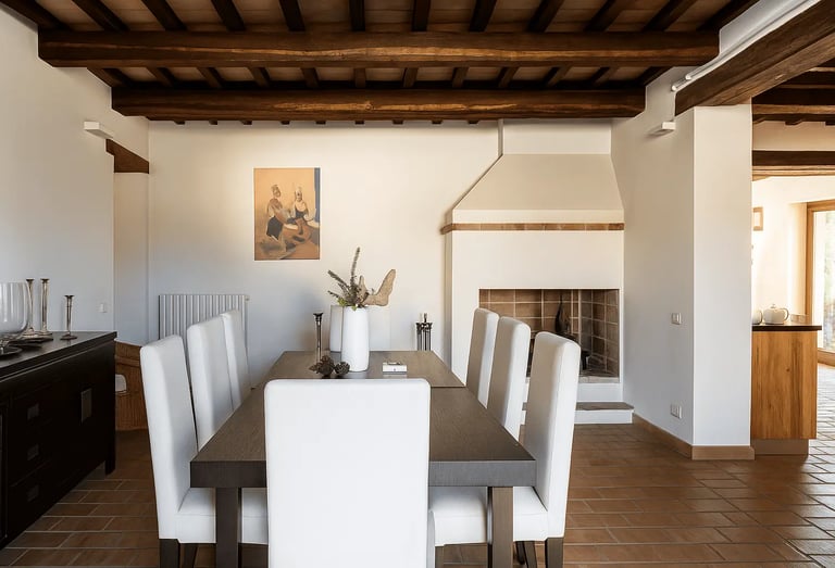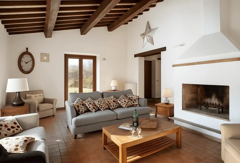 Restaurata con cura e stile, Villa Adele dispone di un ampio soggiorno con comodi divani, un camino antico e pavimenti in cotto che uniscono calore e tradizione. Travi in legno a vista e dettagli studiati creano un’atmosfera accogliente ed elegante.