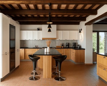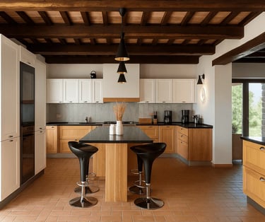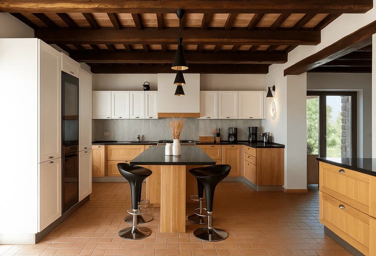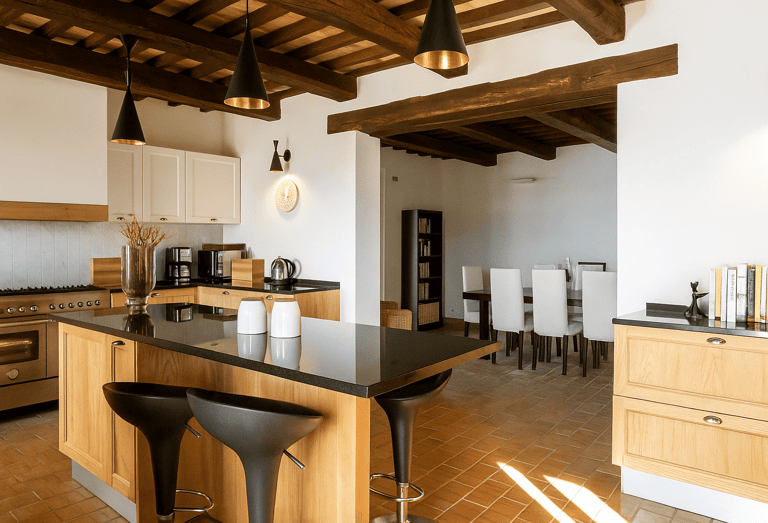 La cucina moderna è completamente attrezzata con elettrodomestici di alta qualità e un’isola centrale, perfetta per cucinare con comodità e condividere i pasti nella zona pranzo adiacente.